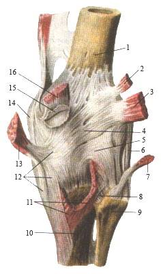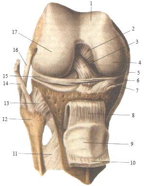 1-надколенниковая поверхность бедренной кости; 2-задняя крестообразная связка; 3-передняя крестообразная связка; 4-медиальный мыщелок бедренной кости; 5-большеберцовая коллатеральная связка; 6-поперечная связка колена; 7-медиальный мениск; 8-связка надколенника; 9-надколенник; 10-сухожилие четырехглавой мышцы бедра (отрезано и опущено вниз); 11-межкостная перепонка голени; 12-головка малоберцовой кости; 13-передняя связка головки малоберцовой кости; 14-сухожилие двуглавой мышцы бедра; 15-латеральный мениск; 16-малоберцовая коллатеральная связка; 17-латеральный мыщелок большеберцовой кости