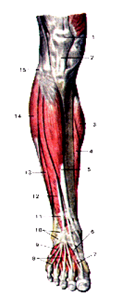 1-надколенник; 2-связка надколенника; 3-икроножная мышца (медиальная головка); 4-камбаловидная мышца; 5-передняя большеберцовая мышца; 6-сухожилие мышцы—длинного разгибателя большого пальца стопы; 7-сухожилие мышцы — короткого разгибателя большого пальца стопы; 8-мышца—короткий разгибатель пальцев стопы; 9-сухожилие третьей малоберцовой мышцы; 10-нижний удерживатель сухожилий мышц-разгибателей; 11-верхний удерживатель сухожилий мышц-разгибателей; 12-мышца-длинный разгибатель пальцев стопы; 13-короткая малоберцовая мышца; 14-длинная мачоберцовая мышца; 15-го-ловка малоберцовой кости.