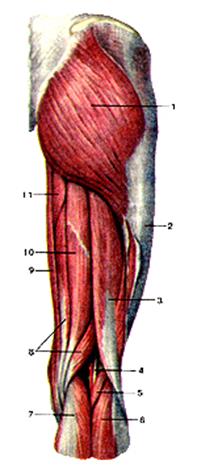 1-большая ягодичная мышца; 2-подвздошно-большеберцовый тракт; 3-двуглавая мышца бедра; 4-нерв и кровеносные сосуды в подколенной ямке; 5-подошвенная мышца; 6-икроножиая мышца (латеральная головка); 7-икроножная мышца (медиальная головка); 8-полуперепончатая мышца; 9-тонкая мышца; 10-полусухожильная мышца; 11-большая приводящая мышца.
