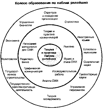 Изложенные выше определения паблик рилейшнз убедительно доказывают, что эта профессия требует комплексной образовательной подготовки специалистов. В системе высшего образования постсоветских государств еще не выработалось четкое представление о подходах и требованиях к такой подготовке, нет комплексных учебных программ общего и специального образования специалистов данного профиля, нет государственных вузов, где бы их готовили. А в реестре специальностей эта профессия вообще не значится. Хочется верить, что это ненадолго. Не до конца разрешенным остается и вопрос преподавания предмета паблик рилейшнз в вузах гуманитарного профиля, учебных курсов и спецкурсов в процессе подготовки кадров, особенно по специальностям рыночного профиля и международных отношений. Для скорейшего разрешения этих назревших проблем необходимо воспользоваться опытом других стран, где система подготовки и переподготовки специалистов по паблик рилейшнз уже давно четко налажена. Заслуживает внимания Золотой доклад МАПР - "Рекомендации и стандарты образования в области паблик рилейшнз", подготовленный бывшим президентом Международной ассоциации паблик рилейшнз Сэмом Влеком в 1990 году. Им, в частности, предложено разрабатывать учебные планы с учетом "Колеса образования" МАПР (см. приведенную схему). Учебный план для студентов, овладевающих профессией паблик рилейшнз, можно представить в виде трех концентрических колец. Самое маленькое охватывает предметы, непосредственно связанные с методологическими и практическими вопросами собственно паблик рилейшнз, о которых речь пойдет ниже. Среднее кольцо схемы содержит предметы, касающиеся общих вопросов коммуникации. И, наконец, третье - самое большое-включает перечень общеобразовательных дисциплин. Все вместе они составляют необходимый минимум базовых знаний, обязательный для специалиста по паблик рилейшнз.