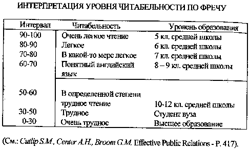 Американские специалисты предлагают также методы определения уровня восприятия текстов на слух. Примером может послужить формула легкости восприятия на слух Ирвина Фенга. Эта формула дает возможность оценить восприятие слушателями теле- и радиосообщений, речей и других устных выступлений. Пределы легкости восприятия текстов на слух, установленные И.Фенгом, во многом совпадают с показателями формулы Р.Фреча. Пределы легкости восприятия текста на слух основаны на расчетах среднего количества слогов (более одного на одно слово) в предложении. Фенг пришел к выводу, что хорошо понятными текстами телевизионных сообщений являются те, где среднее число, рассчитанное по его формуле, меньше 12. (Там же.-Р. 419). Разумеется, предложенные методы определения читабельности и восприятия текстов на слух позволяют вывести лишь общие индикаторы уровня понимания сообщений целевыми группами общественности. Ведь, помимо всего прочего, на понимание текстов существенно влияют жаргон, технические термины, диалектизмы и другие факторы, которые не принимались во внимание в приведенных выше формулах. Однако все это вместе доказывает, что подготовка текстов сообщений для печати или устного изложения должна вестись с учетом возможности конкретной аудитории легко их понять. Предложенные методы и подходы позволяют получить общие количественные и объективные индикаторы, которые могут быть использованы для оценки стиля готовящихся сообщений. Итак, критерии оценки ПР-программы на этапе ее подготовки представляют собой совокупность субъективных и объективных оценок: во-первых, соответствия (полноты) исходных данных, необходимых для основательной ее подготовки; во-вторых, организации и содержания программных материалов; в-третьих, соответствующей "упаковки" и подачи программных материалов. Дальнейший этап оценки связан уже с определением эффективности реализации ПР-программы. ОЦЕНКА ХОДА РЕАЛИЗАЦИИ ПР-ПРОГРАММЫ В большинстве случаев это именно тот этап, когда пиэрмены проводят наиболее активную оценочную работу. Она, как правило, включает практическое использование отобранных (уже в определенной мере упоминавшихся выше) на предварительном этапе критериев и методов, включающих подсчет количества напечатанных публикаций; распространенных пресс-релизов; статей, помещенных в печатных средствах информации; читателей, телезрителей, радиослушателей (потенциальных и реальных). В целом не существует каких-то особых трудностей, которые бы не давали возможности подсчитать объем колонок печатного текста в газетах, количество минут звучания сообщений в эфире, количество присутствующих во время проведения тех или других мероприятий, узнать их общие впечатления и др. Основной предпосылкой успешного выполнения такой работы выступает, во-первых, постоянное отслеживание разнообразных каналов массовой информации и, во-вторых, постоянное ведение записей хода реализации программы. Лишний раз подчеркнем, что без полной документации и оценки информационных и деятельностных составляющих выполнения программы очень трудно контролировать, что сработало, а что нет, и почему. Теперь подробнее рассмотрим критерии и некоторые методы оценки коммуникационной составляющей реализации ПР-программы. Процесс оценки в данном случае начинается с ведения полных за