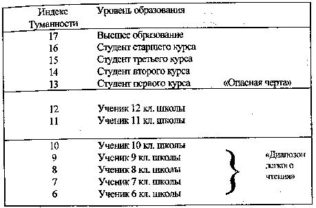 П. Формула Ганнинга. Индекс туманности (Fog Index) Роберта Ганнинга измеряет сложность чтения, исходя из средней длины предложения и процента слов, состоящих из трех и более слогов. Индекс выводится на основе подсчета общего количества предложений, содержащегося как минимум в двух текстах по 100 слов каждый. Сначала количество слов в предложениях делится на количество полных предложений. Затем подсчитывается количество слов, имеющих три и больше слогов (простые предлоги; слова, написанные прописными буквами (аббревиатуры); слова во множественном числе или являющиеся производными, не учитаются). Формула подсчета имеет следующий вид: Индекс туманности. = 0,04 х (среднее количество слов в одном предложении + количество длинных слов на 100 слов). Как и Фреч, Ганнинг тоже предлагает таблицу, которая указывает на уровень образования, необходимый для того, чтобы легко читать текст с тем или иным индексом сложности (туманности). Чем выше индекс, тем выше должен быть уровень образования читателя. (См.: Там же.-Р. 418).