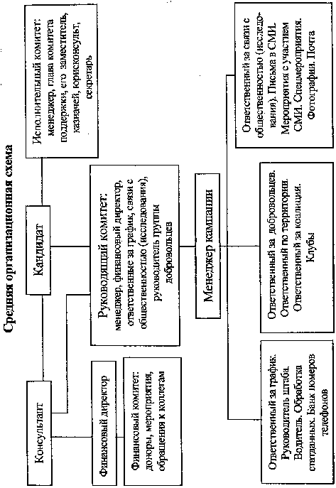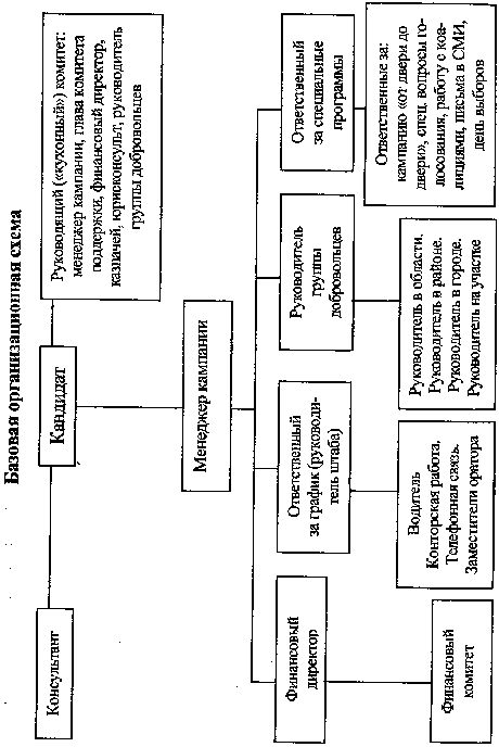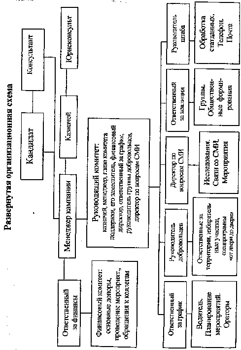 По этой схеме руководитель (менеджер) кампании непосредственно сотрудничает с руководящим ("кухонным") комитетом, в состав которого входят он сам, ответственный за график, финансовый директор, ответственный за связи с общественностью (исследовательскую работу) и руководитель группы добровольцев. В состав исполнительного комитета входят менеджер, председатель комитета поддержки, его заместитель, казначей, юрисконсульт и секретарь. Руководитель (менеджер) кампании руководит работой ответственных за график, работу добровольцев и за связи с общественностью (исследовательскую работу). Ответственный за выполнение графика наблюдает за работой руководителя штаба. Финансовый директор подотчетен руководящему комитету. Консультант кампании работает вместе с кандидатом, руководящим комитетом и финансовым директором. Развернутая организационная схема. Эта организационная схема применяется при проведении крупных по масштабам избирательных кампаний, руководство которыми осуществляется менеджером. Кандидат туг еще более отдален от непосредственного руководства текущими делами и целиком полагается на менеджера в управлении избирательной кампанией. Помимо менеджера, оплачивается еще и труд руководителя по вопросам средств массовой информации, также работающего на постоянной основе. Руководящий комитет действует под председательством менеджера кампании. В состав этого комитета входят председатель комитета поддержки, его заместитель, финансовый директор, казначей, ответственный за соблюдение графика кампании, руководитель группы добровольцев и директор по вопросам средств массовой информации. Казначей, юрисконсульт, финансовый директор выступают советниками менеджера кампании. Консультант по преимуществу имеет дело с менеджером кампании, но может давать советы и кандидату. Подчиненный руководящему комитету, менеджер имеет в своем распоряжении полный штат работников в составе ответственного за график, руководителя группы добровольцев, директора по вопросам СМИ, ответственного за работу с коалициями (группами избирателей с особыми интересами) и руководителя штаба. Существует еще один уровень структуры, состоящий исключительно из добровольцев, который подотчетен этим постоянным штатным работникам.