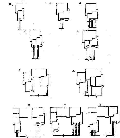 а, б, в, г, д, е, ж - примеры конструкций оконных блоков 15М по высоте; з, и - конструкция однопольных балконных дверных блоков размером 22-7; к - то же, по индивидуальному заказу: с горбыльковым переплетом и глухой филенкой; л - примеры конструкции двупольного балконного дверного блока с двойной фрамугой для общественных зданий размером, 28-18