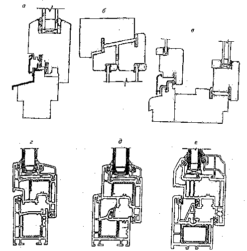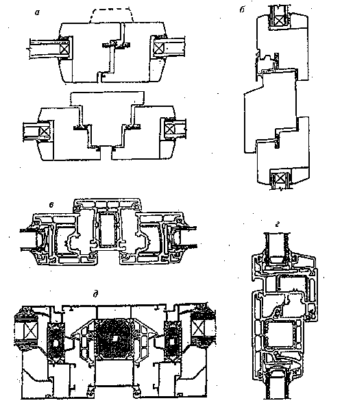a - вертикальные безимпостный (ппулытовой) и импостный притворы деревянного оконного блока; б- горизонтальный импостаый притаор деревянного оконного блока; в - импостный притвор оконного блока из ПВХ профилей; г - узел импостного соединения открывающейся створки и остекленной коробки; д - импостный притвор оконного блока из алюминиевого сплава