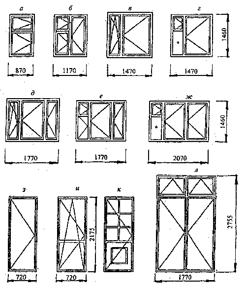 а - одинарный оконный блок с одним стеклом; б - одинарный оконный блок с однокамерным стеклопакетом; в - одинарный оконный блок с двухкамерным стеклопакетом; г - спаренный оконный блок с двойным остеклением; д - спаренный оконный блок со стеклом и стеклопакетом; е - раздельный оконный блок с двойным остеклением; ж - раздельно-спаренный оконный блок с тройным остеклением; э - раздельный оконный блок со стеклом и однокамерным стеклопакетом; и - раздельный оконный блок со стеклом и двухкамерным стеклопакетом; к - раздельный оконный блок с двумя стеклопакетами.