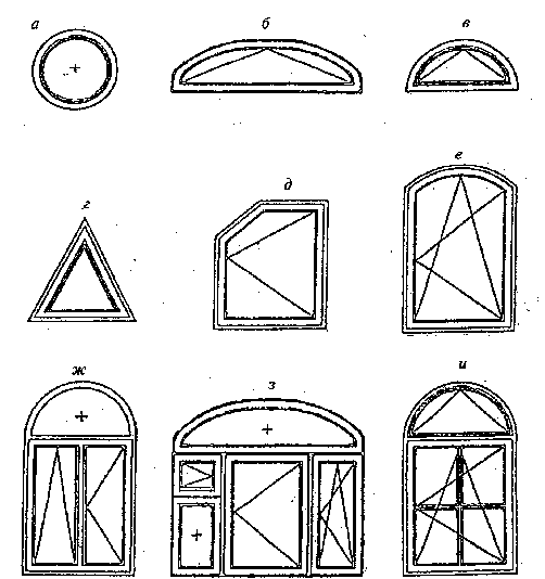 а - круглый не открывающийся оконный блок; б - полуовальный оконный блок с откидным открыванием; в - полукруглый оконный блок с откидным открыванием; г - треугольный оконный блок с откидным открыванием; д - трапециевидный распашной одностворчатый оконный блок; е - полуарочный одностворчатый оконный блок с поворотно-откидным открыванием; ж - арочный двустворчатый оконный блок с откидным и распашным открыванием створок и не открывающейся фрамугой; з - трехстворчатый оконный блок с комбинированным открыванием, форточкой, не открывающейся подфорточной створкой и не открывающейся полуовальной фрамугой; и - арочный одностворчатый оконный блок с поворотно-откидным открыванием створки с горбыльковым переплетом и открывающейся фрамугой
