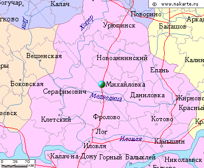Город областного подчинения Расположен на правом берегу р. Медведица (приток Дона), в 210 км к северо-западу от Волгограда. Ж.д. станция Себряково. Возник в 1762 г. как хутор на земле, принадлежавшей донскому полковнику Михаилу Серебрякову и назван по имени землевладельца. До 1948 г. посёлок, затем приобрел статус города Михайловка.