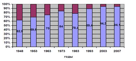 Замедление темпов роста мирового экспорта с 8,5% в 2006 произошло вследствие уменьшения спроса на импорт, главным образом, со стороны Соединенных Штатов, но также Европы и Японии.Темпы роста оставались высокими в большинстве развивающихся стран. Такие регионы как Африка, Ближний Восток, СНГ, развивающаяся Азию, Южная и Центральная Америка показали устойчивый рост своих экономик в 2007 г. В то время как более высокие товарные цены помогли улучшить финансовую ситуацию в некоторых странах, рост цен на энергоносители и продовольствие увеличили инфляционное давление во всем мире.В течение 2000-2007 гг., экспорт в среднем увеличивался на 2,7 процентных пункта быстрее, чем реальный внутренний продукт. Исключением был 2001 г., когда торговля незначительно снизилась из-за террористических актов. Рис.2.Динамика доли стран-членов ГАТТ/ВТО в мировом товарном экспорте
