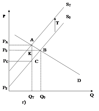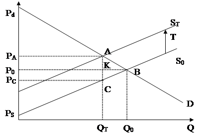 PТ, PМОД – нова рівноважна ціна, утворена на ринку після введення потоварного податку.