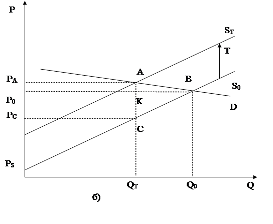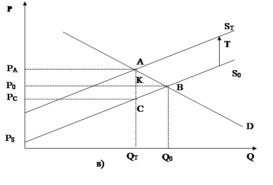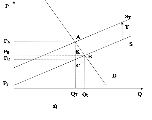 На малюнку(2.14) показана також зміна величини надлишків споживача та продавця, що виникає в результаті введення податку. У вихідному стані ринку надлишок споживача визначався як площа трикутника PdBP0, а надлишок продавця – як площа трикутника Р0BPs. Введення податку Т перемістило криву пропозиції S0 в положення ST, причому надлишок споживача скоротився до PdAPa, а надлишок продавця - до PcCPs. Податкові надходження до бюджету визначаються як площа прямокутника РаАСРс, крім того, суспільство понесло чисті втрати від введення податку у розмірі, що відповідає площі трикутника АВС ( тобто відбулося зниження степені задоволення потреб, та знизився рівень прибутку продавців).