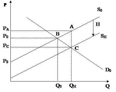 Введення дотації Н зміщує криву пропозиції з положення S0 в положення SН.При цьму розмір надлишку споживача продукції збільшується на величину Р0ВСРс, продавця - на величину Р0ВАРа; сума дотацій, сплачувана державою, визначається як РаАСРс, а трикутник АВС характеризує чисті втрати суспільства від введення дотацій.
