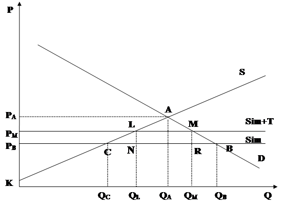 Припустимо, що за відсутності імпорту на ринку встановилася рівноважна ціна Ра, за якою продається Qa товару (Рис. 2.17). Якщо в цих умовах почати імпортувати товари, що виробляються в даній країні за стабільною ціною, сформується крива пропозиції імпортного товару, що буде мати вид горизонтальної прямої (крива Sim).