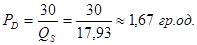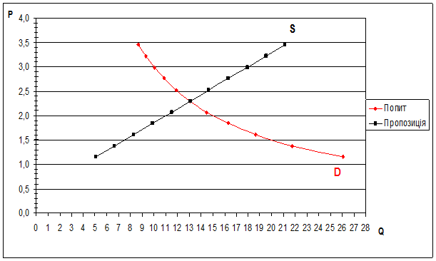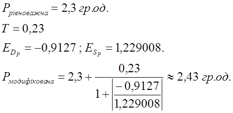 Необхідно зазначити, що коефіцієнти еластичності попиту (ED= - 0,9127) та пропозиції(ES=1,229008), застосовані для розрахунку модифікованої ціни, були вибрані з цінового інтервалу (2,3-2,52) (таблиця 2.2) , оскільки саме на цьому інтервалі відбувається ріст ціни від 2,3 гр.од. до значення модифікованої ціни.