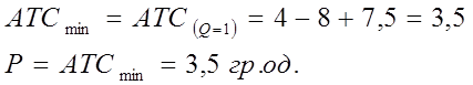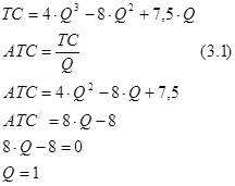 Відомо, що мінімальна ринкова ціна, що забезпечує нормальний прибуток в умовах конкурентного ринку, дорівнює мінімальним середнім витратам (вони, в свою чергу, при мінімальних значеннях дорівнюють граничним витратам). Тому задача зводиться до відшукання обсягу виробництва який мінімізує середні витрати, та визначення мінімального розміру середніх витрат .Функцію середніх витрат (АТС) визначаємо за допомогою функції ва-