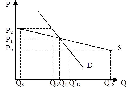 1. Встановлення «потолка» ціни на рівні нижче рівноважної P0 застосовується як міра захисту споживача товару нееластичного попиту (рис 2.12) . В результаті виникає дефіцит в розмірі (Qd-Qs).