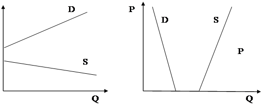 На малюнку 2.9 а) представлена система невизначеного протиріччя між попитом та пропозицією по цінових параметрах. Вона виникає в тому випадку якщо виробництво продукту зв'язане з випуском рідких чи неприйнятних продуктів, що різко підвищує ціну і продукт стає ефективним для споживача.