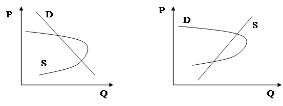 Якщо крапка рівноваги ринку існує, то вона може бути не єдиної. На малюнку 2.10 показаний випадок існування двох крапок рівноваги, можливий за умови існуванні специфічної кривої пропозиції.