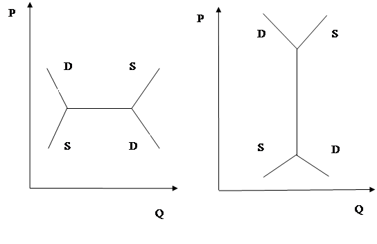 Можливі також випадки безлічі крапок рівноваги (малюнок 2.11). Варіант (а) виникає тоді, коли на даному ринку сформувалася олігопольна структура та ні одна з фірм-виробників не квапиться змінювати рівень цін через страх різкої реакції конкурентів. Варіант (б) зв’язаний зі зміною еластичності попиту та пропозиції в різних цінових діапазонах. При цьому на спільних відрізках кривих плани споживачів і виробників збігаються.