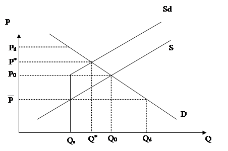 Але при даному об’ємі пропозиції Qs ціна попиту Pd вище встановленної «потолка» , в результате чого формується «чорний ринок» даного товару, характеристиками якого являються вихідна крива попитуD та крива пропозиції «чорного ринку» Sd, що має вид ломаної. Вертикальний відрізок кривої Sd показує процес повернення ринку до рівноважної ціни Р0 при об’ємі продажів Qs; восходячий відрізок – процес формування природної кривої в нових умовах. Рівновага встановлюється при ціні Р1 > Р0 >> (ціна враховує ризик продавця) та об’єму продажів Q*<Q0. Таким чином, встановлення потолка ціни може мати еффект, протилежний очікуваному : замість зниження ринкової ціни спастерігається її ріст.