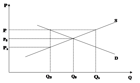 б) встановленні дотацій на кожнуодиницю продукції, проданую зверх Qd{втрати складають ( -Ps) (Qs-Qd)}.
