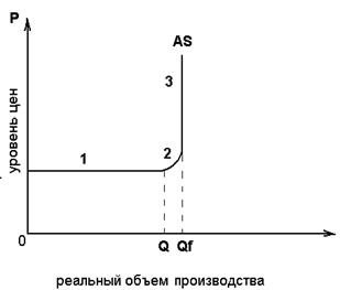 На графике Qf обозначает потенциальный уровень реального производства при полной занятости. Горизонтальный отрезок 0Q значительно меньше, чем объем национального производства при полной занятости. Следовательно, горизонтальный отрезок свидетельствует о том, что экономика находится в состоянии глубокого спада или депрессии, что не используется большое количество машин, оборудования и рабочая сила. На этом отрезке увеличение или уменьшение объема национального производства не оказывает влияния на уровень цен, т. е. цены на товары и заработная плата остаются неизменными.