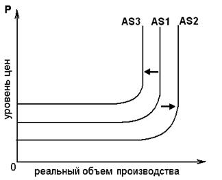 Неценовые факторы совокупного предложения могут смещать кривую совокупного предложения вправо или влево. Если кривая совокупного предложения смещается вправо от AS1 к AS2 (рис.2.2.), то совокупное предложение увеличивается, а если влево от AS1 к AS3, то оно уменьшается.