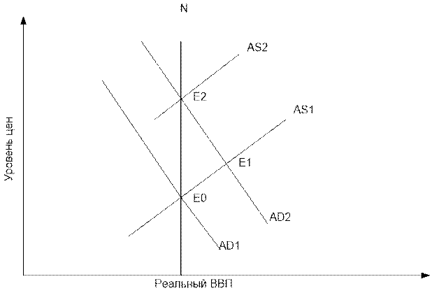 Для иллюстрации макроэкономического равновесия необходимо соединить кривую совокупного спроса AD1, a также долгосрочную N и краткосрочную AS1 кривые совокупного предложения (рис.3.1.). Точка пересечения всех трех кривых Ео [3, стр.378]: