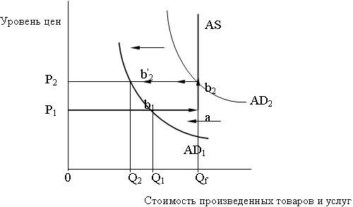 На промежуточном отрезке кривой совокупного предложения между Q и Qf увеличение реального объема национального производства сопровождается ростом уровня цен. Это объясняется тем, что полная занятость возникает не одновременно и неравномерно во всех отраслях промышленности. В некоторых отраслях может возникнуть дефицит рабочей силы, что приведет к росту заработной платы, а, следовательно, к росту издержек производства и цен. Когда производство начинает работать на полную мощность, то некоторые фирмы, расширяя производство, начинают менять старое, менее производительное оборудование, а это тоже ведет к росту издержек производства и цен.