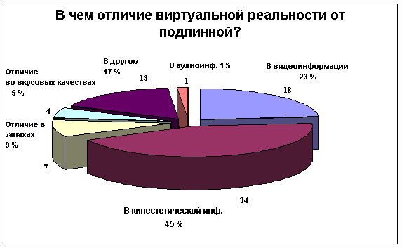 Как видно на диаграмме, респонденты выразили практически полное единодушие в том, что не видят разницы между информацией аудиального характера, получаемой как в подлинной, так и в виртуальной реальностях. Почти четверть респондентов заявила о том, что видит различие в специфике информации визуального характера. Но существенным признаком отличия большинство (45%) все же назвали кинестетическую информацию. Другими словами, в виртуальной реальности, практически для полного слияния с подлинной реальностью, не хватает тактильных ощущений.
