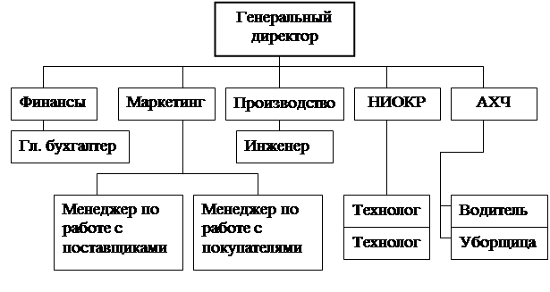 Структура должна отражать цели и задачи организации, а следовательно, быть подчиненной производству и меняться вместе с происходящими в нем изменениями. Она должна отображать функциональное разделение труда и объем полномочий работников управления. Для фирмы "КВИК" в силу относительно не большого ассортимента продукции, ее функционирования на внутреннем рынке, в соответствии с выбранной стратегией, а также из-за ограниченности численности ее персонала наиболее подходящей является линейно- функциональная структура (рис. 2.1), в которой можно выделить следующие отделы: финансовый отдел, маркетинговый отдел, производственный и административно-хозяйственный отделы.