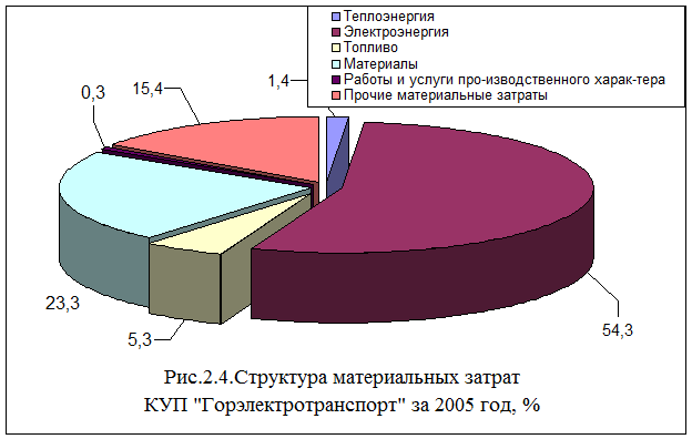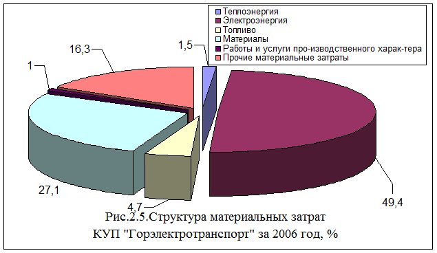 Наибольший удельный вес в материальных затратах в 2005 году составляли затраты на электрическую энергию – 54,3 %, в 2006 году затраты на электроэнергию в удельном весе снизились на 4,9 %.