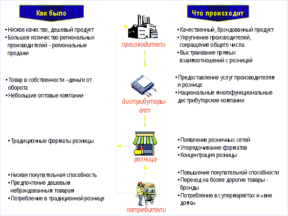 - Сокращение промежуточных звеньев распределительной цепочки. Стремление к сокращению числа посредников в цепочке распределения присутствует как на одном ее конце (у производителей), так и на другом (у розницы). Крупнейшие розничные операторы, такие как Копейка, Пятерочка вкладывают значительные средства в строительство своих собственных распределительных центров. У Копейки свыше 80% всего ассортимента идет через собственные распределительные центры, что означает, что эта сеть очень мало зависит от оптового звена: производители имеют возможность напрямую делать поставки в сеть. Распределительный центр площадью 30 тыс. кв. м., оснащенный самыми современными технологиями, построила Пятерочка. С другой стороны, производители, используя возможность сокращения торговых наценок в канале и открывающуюся возможность большего контроля цен, организуют прямые поставки в розницу - как сетевую, так и одиночные магазины. Так, например, действуют Ладога, Черкизовский и другие производители.