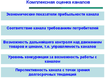 Важная роль посредников в представлении марки означает для производителя необходимость постоянного контроля за работой этих звеньев. Предлагаем использовать методику оценки каналов сбыта, которая позволит выявить наиболее перспективные каналы и определить те из них, которые, возможно, потребуют закрытия, т.е провести оптимизацию используемых каналов. Основные составные части этой методики представлены на рисунке.