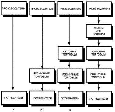 На рисунке 2.3 приводится схема, характеризующая важнейшие типы каналов распределения потребительских товаров, начиная с прямого маркетингового канала, в котором отсутствуют какие-либо посредники (а) и заканчивая сложным его видом, включающим, помимо оптовых и розничных торговцев, также других (функциональных) торговых посредников (г). В других видах каналов распределения функциональные посредники могут находиться между оптовыми и розничными торговцами.