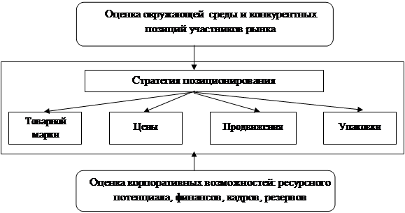 Процесс разработки стратегии позиционирования начинается с маркетинговых исследований, направленных на оценку факторов внешней среды, конкурентных позиций с выделением явных преимуществ, очевидных недостатков и возможных резервов. Одновременно с этим необходимо выполнить и мониторинг корпоративных возможностей с позиции реального наличия ресурсов, качества менеджмента, скрытых резервов.