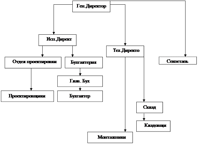 Это ступенчатая иерархическая структура, в которой во главе стоит начальник (генеральный директор), а ему оказывают помощь функциональные органы, это исполнительный и технический директора. Руководители функциональных подразделений подготавливают проекты планов отчетов, которые превращаются в официальные документы после подписания их генеральным директором. Можно сделать вывод, что это линейно-функциональная структура управления.