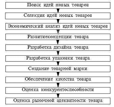Процесс создания нового товара включает в себя восемь этапов: формирование идей, отбор идей, разработка замысла и его проверка, разработка стратегии маркетинга, анализ возможностей производства и сбыта, разработка товара, испытания в рыночных условиях и развертывание коммерческого производства.