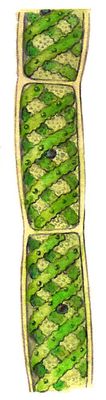 Характерным признаком спирогиры является лентовидный, спирально изогнутый хроматофор, расположенный в постенном слое цитоплазмы. В центре клетки находится ядро, заключенное в цитоплазматический мешочек и подвешенное на цитоплазмати-ческих тяжах в крупной вакуоле.