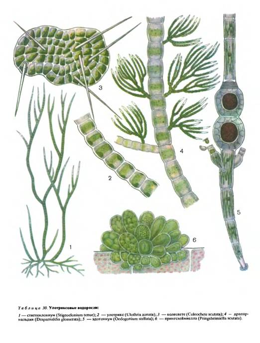 Слоевище улотриксовых построено по типу однорядной неразветвленной нити. Оно слагается клетками, подобными друг другу по строению и функции (табл. 30, 2). Потенциально все клетки способны делиться и участвовать в росте растения, точно так же все клетки могут образовывать споры и гаметы. Отличается от остальных лишь клетка в основании нити: с ее помощью осуществляется прикрепление слоевища к субстрату (у прикрепленных форм). Клетки улотриксовых обладают значительной автономностью. С этим свойством связана способность к регенерации и вегетативному размножению — отдельные клетки или участки нитей легко отрываются от нитей и переходят к самостоятельному росту