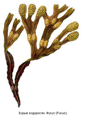(Phaeophyta), тип споровых растений, включающий 240 родов (1500 видов), из которых 3 — пресноводные, остальные — морские. Слоевища от оливково-зелёного до темно-бурого цвета из-за присутствия в хроматофорах особого бурого пигмента фукоксантина (C40H56O6), маскирующего др. пигменты (хлорофилл а, хлорофилл с, ксантофилл и бета-каротин). Бурые водоросли разнообразны по форме и размерам (от микроскопических разветвленных нитей до 40-метровых растений). У высших бурых водорослей (например, ламинариевых водорослей) наблюдаются дифференциация тканей и появление проводящих элементов. Для бурых водорослей характерны многоклеточные волоски с базальной зоной роста, отсутствующие у других водорослей. Оболочки клеток содержат целлюлозу и специфические вещества — альгин и фукоидин. Обычно в каждой клетке одно ядро. Хроматофоры большей частью мелкие, дисковидные. У некоторых видов бурых водорослей есть пиреноиды, мало похожие на пиреноиды др. водорослей. В клетке вокруг ядра скапливаются бесцветные пузырьки с фукозаном, обладающим многими свойствами танина. В качестве запасных продуктов в тканях бурых водорослей накапливаются маннит (многоатомный спирт) и ламинарин (полисахарид), реже масло. Размножаются бурые водоросли половым и бесполым путём, редко вегетативно. Обычно у бурых водорослей имеются спорофит и гаметофит; у высших (ламинариевые, десмарестиевые и др.) они строго чередуются; у циклоспоровых гаметофиты развиваются на спорофитах; у примитивных (эктокарповые, хордариевые, кутлериевые и др.) гаметофит или спорофит может выпадать из цикла развития или появляться раз в несколько поколений. Органы размножения — одногнёздные или многогнёздные спорангии. Многогнёздный спорангий, который чаще функционирует как гаметангий, образуется в виде одной клетки или серии клеток, делящихся перегородками на камеры, содержащие внутри по одной гамете или споре. Мейоз происходит обычно в одногнёздных спорангиях, у диктиотовых — в тетраспорангиях. Половой процесс — изогамия, гетерогамия или оогамия. Грушевидные споры и гаметы обычно с глазком, имеют сбоку по два жгутика, один направлен вперёд, другой — назад. бурые водоросли делятся на 3 класса: Aplanosporophyceae (только диктиотовые), Phaeosporophyceae (гетерогенератные и изогенератные, за исключением диктиотовых) и Cyclosporophyceae (циклоспоровые). бурые водоросли распространены во всех морях, особенно в холодных, где образуют большие заросли. Используются для получения альгиновых кислот и их солей — альгинатов, а также кормовой муки и применяемого в медицине порошка, содержащих йод и другие микроэлементы. Некоторые бурые водоросли используются в пищу.