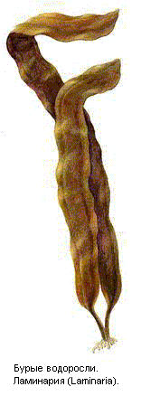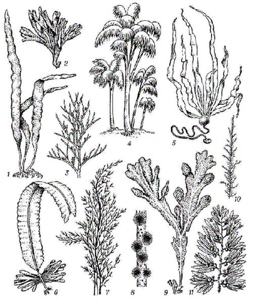 Бурые водоросли: 1 — ламинария; 2 — диктиота; 3 — эктокарпус; 4 — лессония; 5 — нереоцистис; 6 — алярия; 7 — цистозира; 8 — кустики элахисты на стволике другой водоросли; 9 — фукус; 10 — диктиосифон; 11 — саргассум (все, кроме 3 и 8, сильно уменьшены; 3 — вид под микроскопом, увеличено приблизительно в 40 раз).