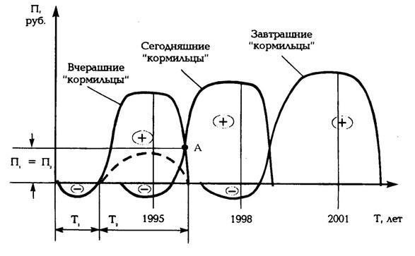 На рис. 4.5 показана динамика сменяемости и прибыльности моделей товара одного назначения (наименования). Названия циклов - вчерашние "кормильцы", сегодняшние "кормильцы", завтрашние "кормильцы" - заимствованы из работы Е. В. Деминой. На схеме показан пример воспроизводства моделей товара с применением воспроизводственного подхода, т. е. для поддержания конкурентоспособности модели каждая будущая модель прибыльнее вчерашней.