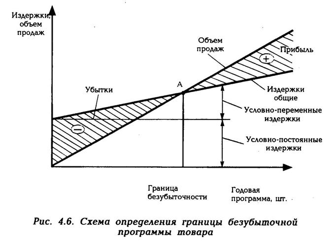 Одним из показателей устойчивости функционирования фирмы и гарантированного ее развития является безубыточность годовой программы выпуска товара, ее минимальное значение. На рис. 4.6 показана схема определения границы безубыточности программы товара.