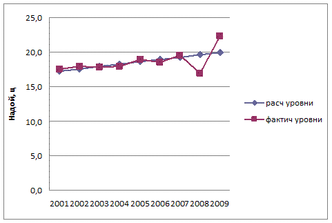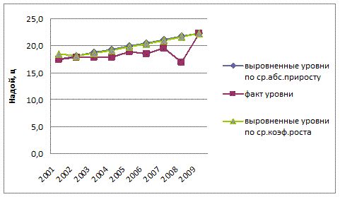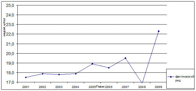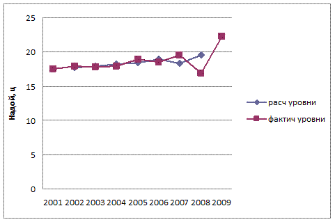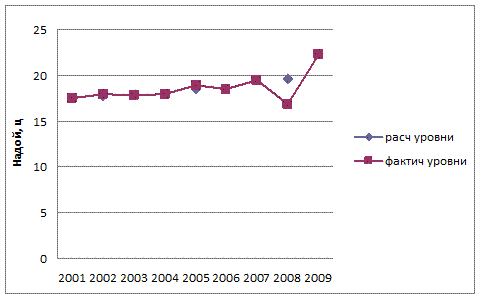 Анализ динамики удоя молока показал непрерывный процесс роста: ежегодный рост составляет 0,6 ц или 3,1%. В итоге, за период с 2001г. по 2009г. рост показателя удой составил 4,8 ц или 27,4%.