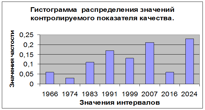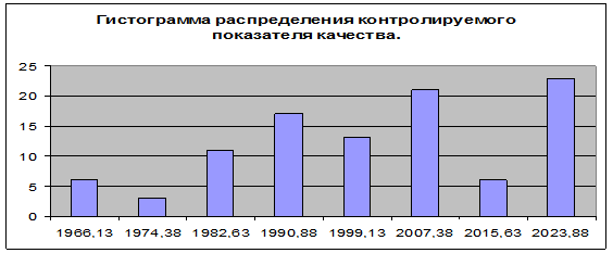 В данной работе был проведен анализ распределения контролируемого показателя качества – масса отливки. При анализе диаграммы можно сделать выводы о том, что гистограмма не имеет высокой центральной части. Такая гистограмма получается, когда объединяются несколько распределений, в которых средние значения отличаются незначительно. Среднее значение х равномерно удалено от центра нормы, но из-за большого разброса края выходят границу нормы – появляется брак.