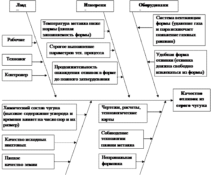 Построена диаграмма Исикавы. Так же построена диаграмму Парето и проведена оценка основных видов дефектов и оценка качества отливок из серого чугуна по участкам. Анализ работы этих участков и выявление причин возникновения данного процента брака на участках будет эффективным для решения проблемы. Построены контрольные карты Шухарта ((X-R)-карты) для контролируемого показателя качества – массы отливки. Из построенных карт видно, что значения величин не выходят за границы регулирования, следовательно, технологический процесс изготовления отливок из серого чугуна протекает стабильно, вмешательство в ход технологического процесса не требуется, погрешностей нет.
