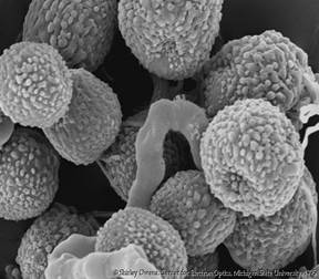 Для многих гриб — это вертикальная ножка, увенчанная шляпкой. Такая ассоциация не менее проста, чем параллели «дерево — яблоко» или «вода — рыба». Ведь лишь небольшая часть, представителей огромного царства грибов, подходит под привычное описание. Плодовое тело собственно гриба представляет собой сплетение тонких нитей — гифов, каждая из которых является цепочкой клеток, соединенных друг с другом концами. Гифы могут собираться в плотные трехмерные структуры (именно так устроены знакомые нам плодовые тела шляпочных грибов), образовывать правильные формы.