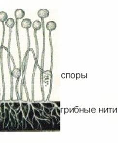 Плесневые грибы появляются на старом хлебе, кусочке сыра или забродившем варенье. Почему же хлеб и варенье начинают плесневеть? Потому что при соприкосновении с воздухом на них попадают споры плесневых грибов. Каждая спора - это живая клетка, чье ядро и цитоплазму окружает плотная клеточная оболочка. Если спора попадает в благоприятные условия, то из нее развивается грибница. Грибница состоит из тонких бесцветных нитей и составляет тело гриба. Грибница - это одна разросшаяся клетка. Через оболочку грибные нити выделяют в окружающую среду вещества, которые растворяют разные питательные вещества - белки, жиры, углеводы и многочисленные другие соединения. Растворенные вещества впитываются внутрь грибницы. За их счет происходит рост и развитие гриба. Грибные нити не содержат хлорофилла. Если у плесневых грибов достаточно пищи, то некоторые нити вырастают вверх и образуют споры.