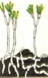 . Если хлеб положить на несколько дней в теплое влажное место, то на нем может появиться белый пушистый налет, который через некоторое время темнеет. Это плесневый гриб-сапрофит мукор. Он часто поселяется также на фруктах, овощах, на конском навозе. Грибница мукора представлена всего лишь одной сильно разросшейся и разветвленной клетки с множеством ядер в цитоплазме. Размножается этот гриб как обрывками грибницы, так и спорами. Некоторые нити грибницы поднимаются вверх, превращаясь в спорангиеносец, и расширяются на концах. В этих черных расширениях (спорангиях), похожих на головки, образуются споры.После созревания спор спорангии лопаются и споры разносятся ветром. В благоприятных условиях они прорастают в грибницу.